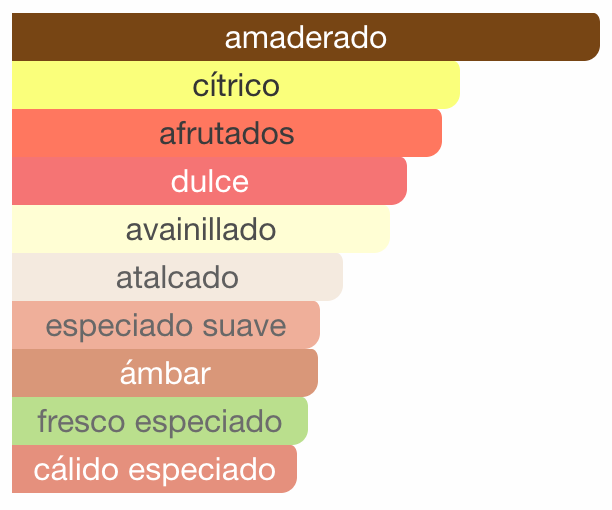 Las Notas de Corazón son vainilla, ámbar, azúcar, Madera seca, azafrán y lirio de los valles (muguete)