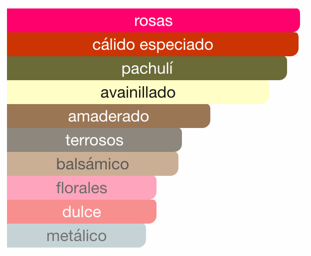 Las Notas de Salida son rosa de Bulgaria (rosa Damascena de Bulgaria) y rosa de mayo